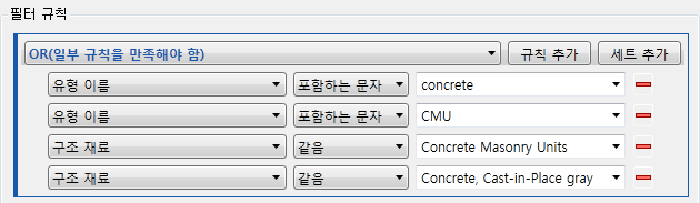 AND(유형 이름에 "콘크리트" 포함 OR 유형 이름에 "CMU" 포함 OR 구조 재료 = "콘크리트 석조 단위" OR 구조 재료 = "콘크리트, 현장타설 회색")