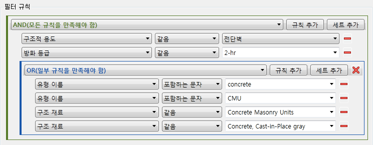 이 경우, 모델에서 콘크리트로 되어 있고 2시간 방화 등급이 있는 모든 전단 벽을 식별하려면, 다음과 같이 AND 규칙 세트로 시작하고 그 안에 OR 규칙 세트를 내포해야 합니다.
