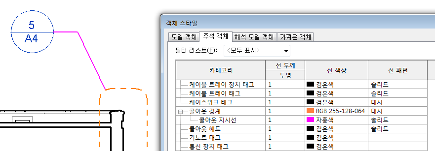 - 선 두께, 선 색상 및 선 패턴 열을 사용하여 콜아웃 경계, 콜아웃 지시선 및 콜아웃 헤드에 대해 원하는 설정을 지정합니다.