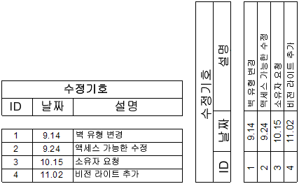 제목 블록에서 수정기호 일람표를 시계 방향이나 시계 반대 방향으로 90도 회전할 수 있습니다. 수정기호 일람표를 회전하려면 제목 블록 패밀리를 수정합니다. 프로젝트의 특정 시트에서 수정기호 일람표를 회전할 수 없습니다.
