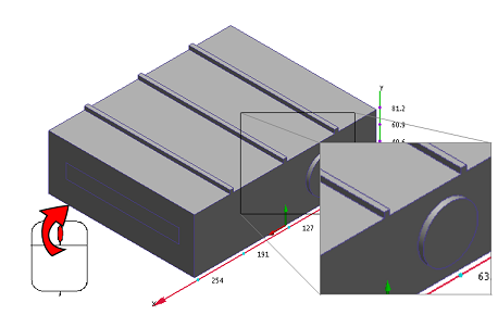 모형을 회전하려면 ViewCube 위로 마우스를 가져간 후 왼쪽 버튼을 누른 채 마우스를 끕니다. 모형 방향을 변경하려면 ViewCube에서 면, 모서리 또는 구석을 클릭합니다.