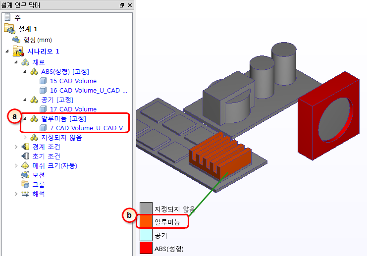 7. 알루미늄 재료를 제대로 지정했는지 확인하려면 설계 연구 막대와 부품 색상을 확인합니다.