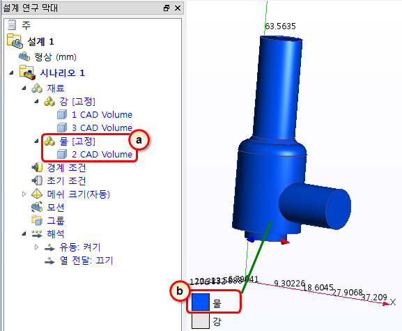 6. 해당 물 재료가 제대로 지정되었는지 확인하려면 설계 연구 막대 및 부품 색상 지정을 확인합니다.