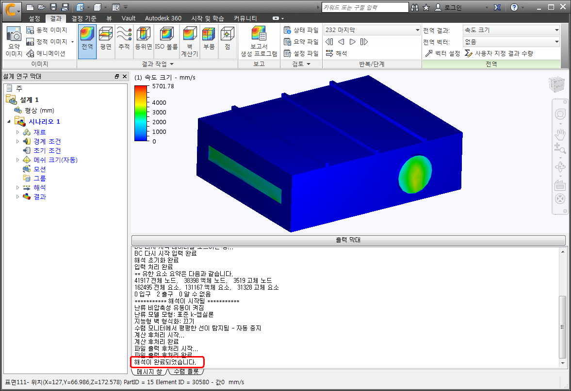 주: 처음 100번 반복하는 동안 온도 결과는 변경되지 않습니다. 열 전달을 해석하기 전에 자동 강제 대류는 100번의 흐름 전용 반복을 실행합니다. 공기가 부력 효과를 제거할만큼 충분히 빠르게 이동하므로 이렇게 할 수 있습니다. 부력이 적절하면 흐름 및 열 전달을 함께 해석할 수 있습니다.