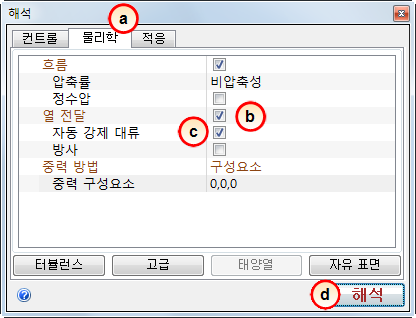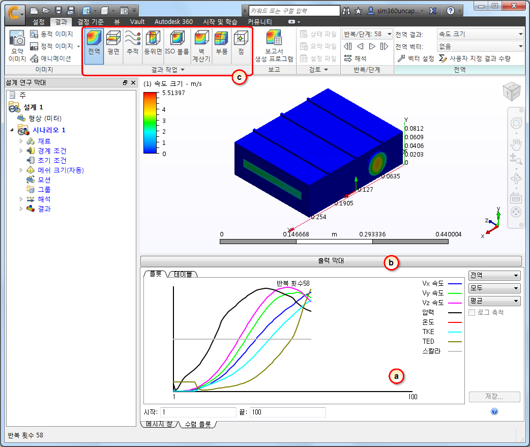 a. 수렴 플롯은 시뮬레이션 동안의 계산 조건을 표시합니다. 선이 평평해지면 솔루션은 더 이상 변경되지 않으며 시뮬레이션이 완료됩니다.