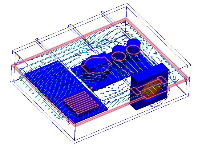 이를 통해 엔클로저를 통과하는 흐름을 잘 볼 수 있습니다. 또한 팬 왼쪽으로 재순환이 진행되는 것을 알 수 있습니다. 이 공기로는 구성요소를 냉각하지 못할 것입니다. 또한 변압기 및 콘덴서 위로 흐르는 강력한 제트 기류도 확인할 수 있습니다. 뒤쪽 표면에 영향을 미친 후에 이 제트 기류는 PCB의 6개 칩 위로 흐릅니다.
