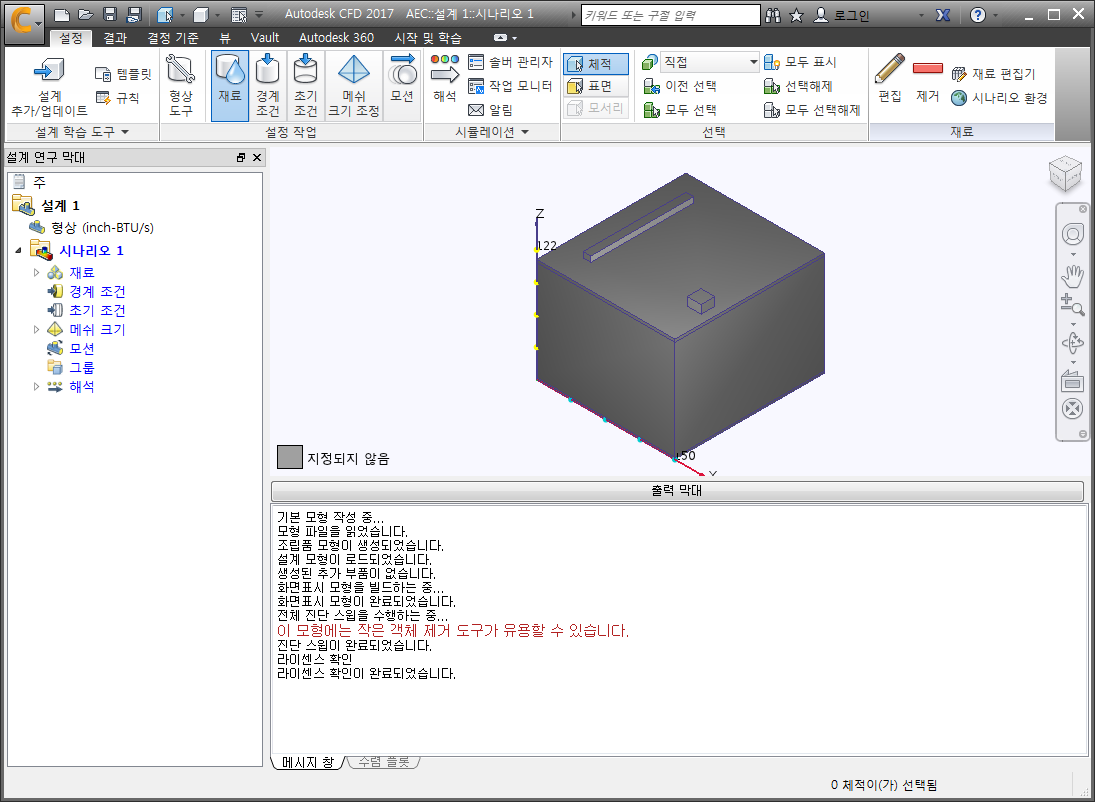 Autodesk® CFD가 시작되고 모형이 표시되어야 합니다. 축의 치수 값을 기록합니다.