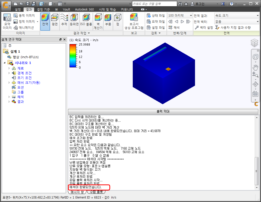 시뮬레이션이 완료되면 출력 막대에 "해석이 완료되었습니다."가 표시됩니다.