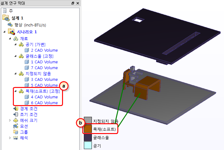 a. 설계 연구 막대에서 목재(소프트) 부품에 대한 재질 지정을 확인합니다.