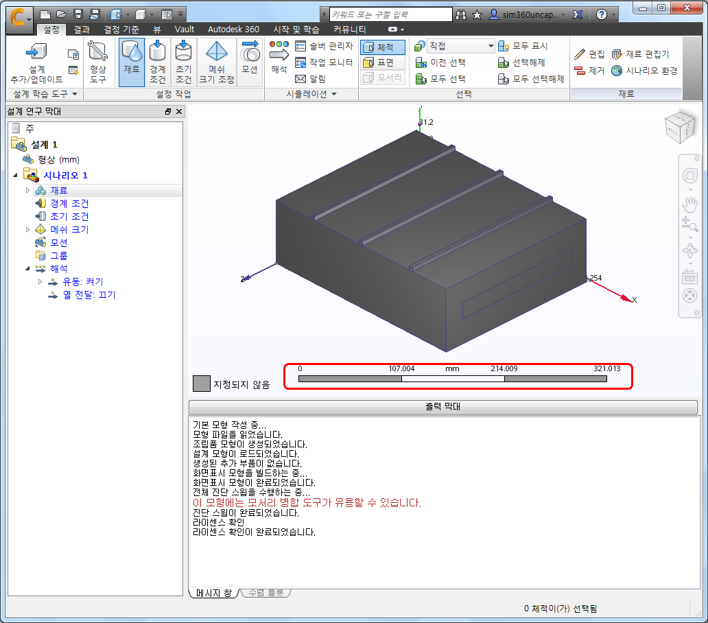 Autodesk® CFD가 시작되고 모형이 표시되어야 합니다. 축척의 치수 값을 기록합니다.