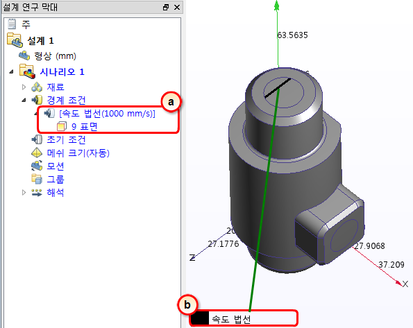 6. 경계 조건이 입구에 올바르게 지정되었는지 확인하려면 설계 연구 막대 및 입구 표면의 색상 줄무늬를 확인합니다.