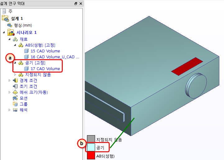 6. 공기 재료가 제대로 지정되었는지 확인하려면 설계 연구 막대와 부품 색상 지정을 확인합니다.