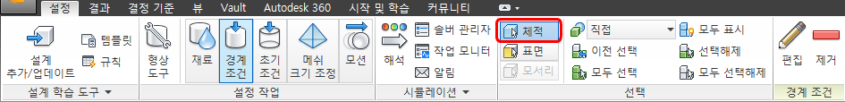 1. 선택 모드를 변경하려면 설정(탭) > 선택(패널) > 체적을 클릭합니다.