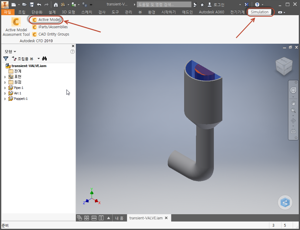 예를 들어 Autodesk® Inventor에서 시작하는 경우 시뮬레이션 및 활성 모형을 클릭합니다.