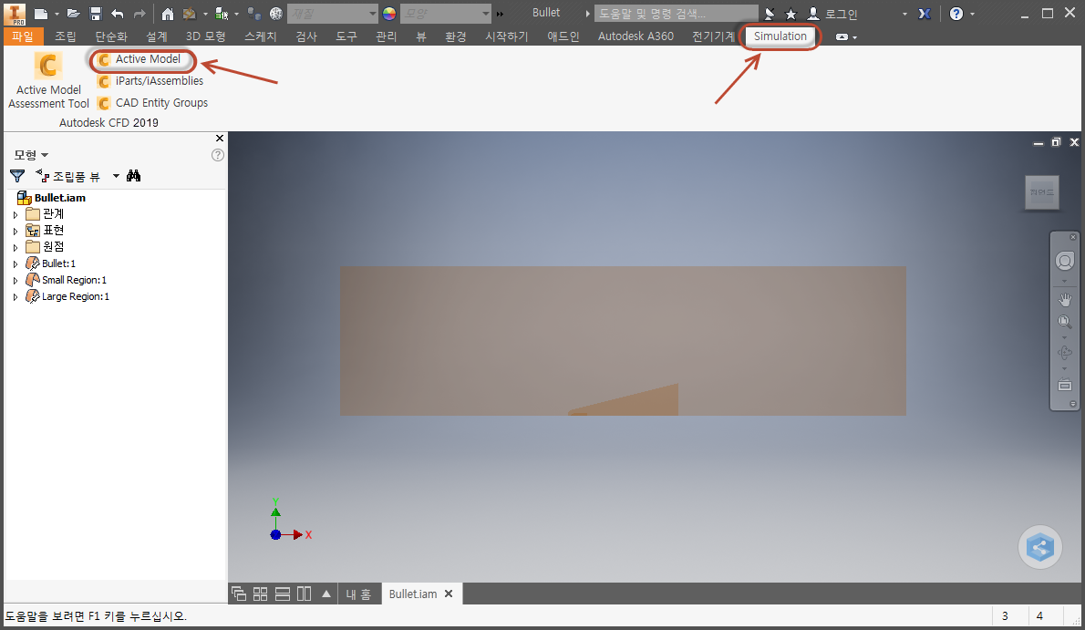 예를 들어 Autodesk® Inventor에서 시작하는 경우 시뮬레이션 및 활성 모형을 클릭합니다.