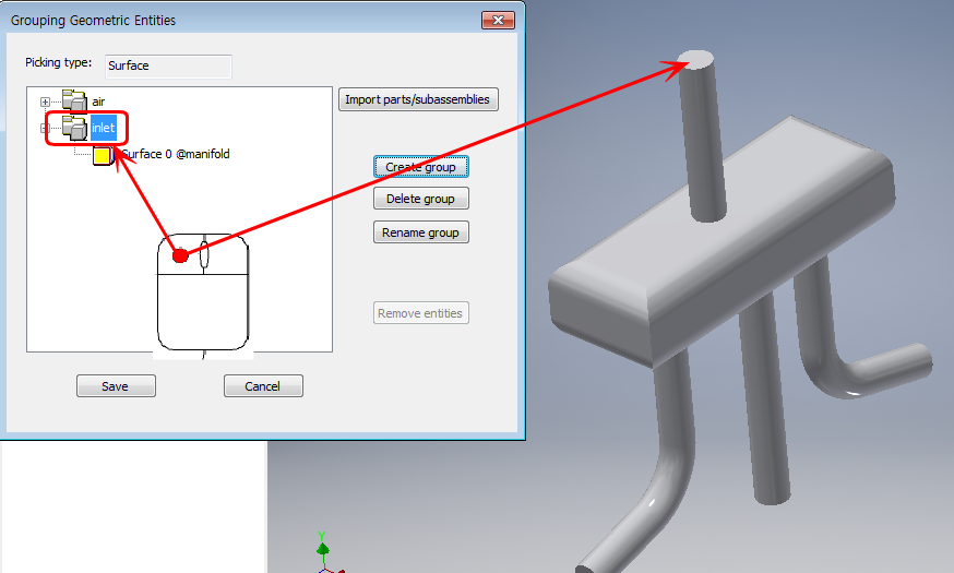 입구 그룹을 클릭하고 입구 표면을 선택합니다.