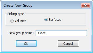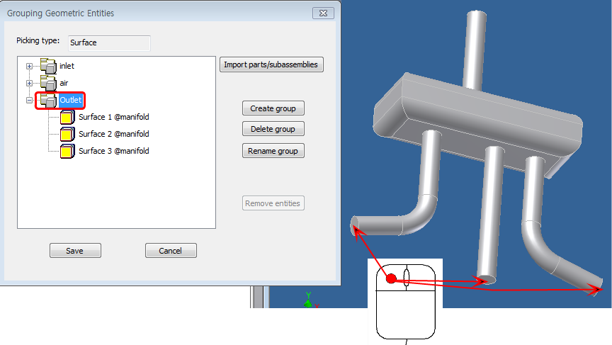이 단계에서는 두 개의 CAD 도면요소 그룹을 작성합니다. 하나에는 입구 표면이 포함됩니다. 다른 그룹에는 세 개의 출구 표면이 포함됩니다. 이전 단계에서 작성한 규칙은 CAD 도면요소 그룹에 추가된 표면을 참조합니다.