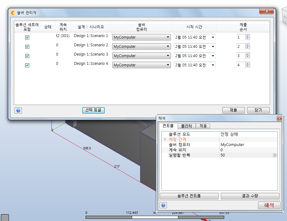 솔버 관리자를 열려면 모형을 마우스 오른쪽 버튼으로 클릭하고 및 솔버 관리자...를 선택합니다.