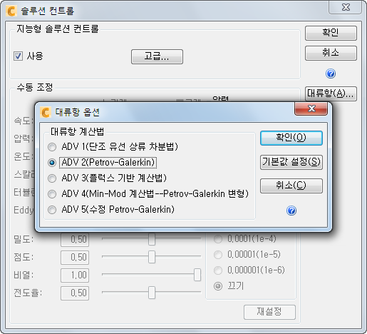 해석 대화상자에서 솔루션 제어를 클릭하고 대류항을 클릭합니다. 대류항 옵션 대화상자에서 ADV2를 선택합니다. 확인을 클릭하고 솔루션 제어 대화상자에서 확인을 클릭합니다.