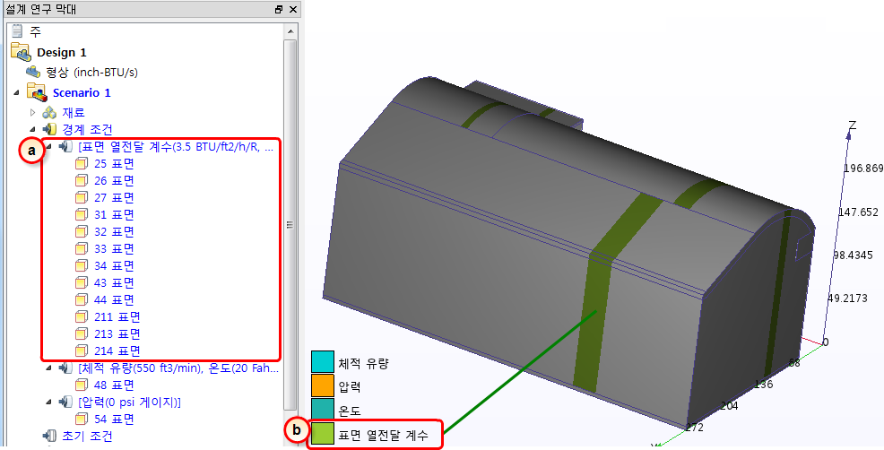 15. 필름 계수 경계 조건이 외부 표면에 제대로 적용되었는지를 보려면 표면의 설계 연구 막대 및 색상 줄무늬를 확인하십시오.