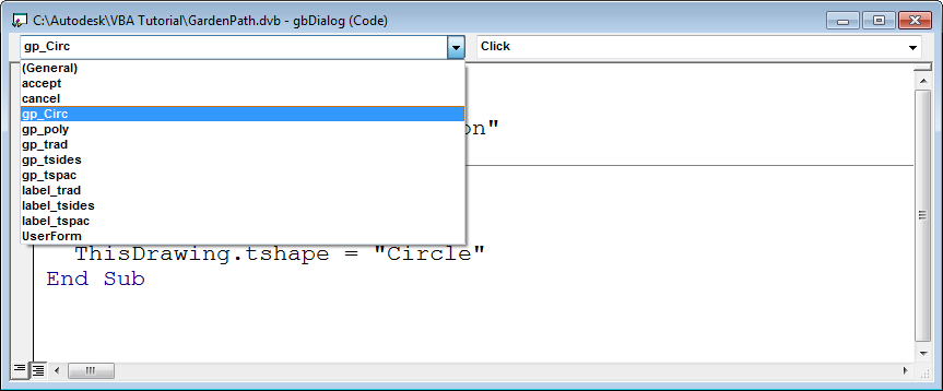 The code disables the gp_tsides text box and sets the tshape variable of the ThisDrawing module to the text string Circle.