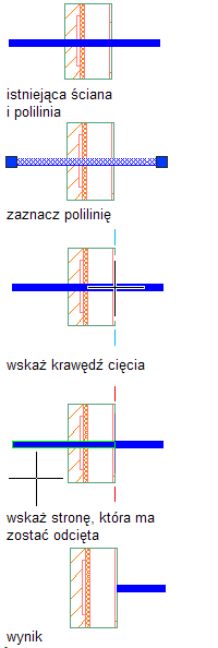 Ta procedura służy do precyzyjnego ucinania jednej lub kilku linii, polilinii, łuków, okręgów, kreskowań, wielokątów AEC, wyciągnięć elementów bryłowych lub pomieszczeń do wybranej krawędzi lub strony prostego segmentu szkicu AEC. Funkcja ta umożliwia dokładne ucięcie szkicu do komponentów ścian.