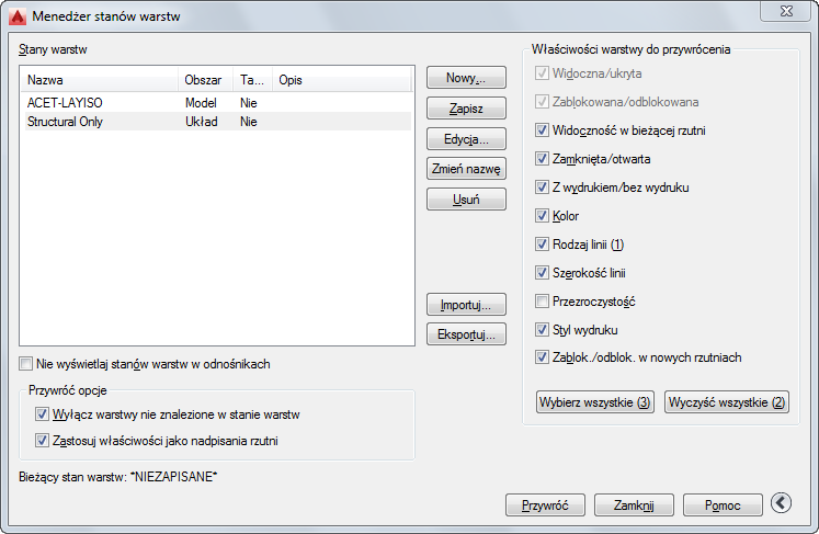 Ustawienia warstw obejmują stany warstw, takie jak włączona lub zablokowana, oraz właściwości warstw, takie jak kolor lub rodzaj linii. Można wybrać, które stany i właściwości warstw mają zostać przywrócone w przyszłości. Na przykład można wybrać tylko przywrócenie ustawień zablokowanych/odblokowanych warstw na rysunku, ignorując wszystkie inne ustawienia. Jeżeli przywrócony zostanie stan warstwy o danej nazwie, wszystkie ustawienia pozostaną niezmienione, z wyjątkiem określonego stanu warstwy jako zablokowanej lub odblokowanej.