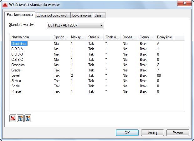 Standardy warstw ustanawiają konwencje nazewnictwa warstw na rysunku. Standard warstw zawiera zestaw reguł, które określają strukturę nazw warstw na rysunku. Podczas instalowania programu można wybrać standardy warstw z listy standardów. W razie potrzeby można później zmienić lub edytować każdy standard warstw.