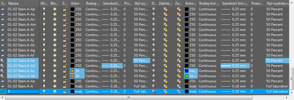 Obecnie użytkownik może nadpisywać kolor, rodzaj linii, szerokość linii oraz styl wydruku dla warstw w poszczególnych rzutniach układu. Jest to wydajny sposób wyświetlania obiektów o różnych ustawieniach właściwości w indywidualnych rzutniach, bez zmiany ich własności JakWarstwa i JakBlok. Ponieważ nadpisanie właściwości warstwy nie zmienia ogólnych właściwości warstwy, można wyświetlać obiekty w różny sposób w różnych rzutniach, bez konieczności tworzenia nowej geometrii lub używania odniesień o innych ustawieniach warstwy. Jeżeli Menedżer właściwości warstw zostanie otwarty z karty Układ, wyświetlane są 4 dodatkowe kolumny do nadpisywania własności warstwy charakterystycznych dla rzutni - Kolor rzutni, Szerokość linii rzutni, Rodzaj linii rzutni, Styl wydruku rzutni.
