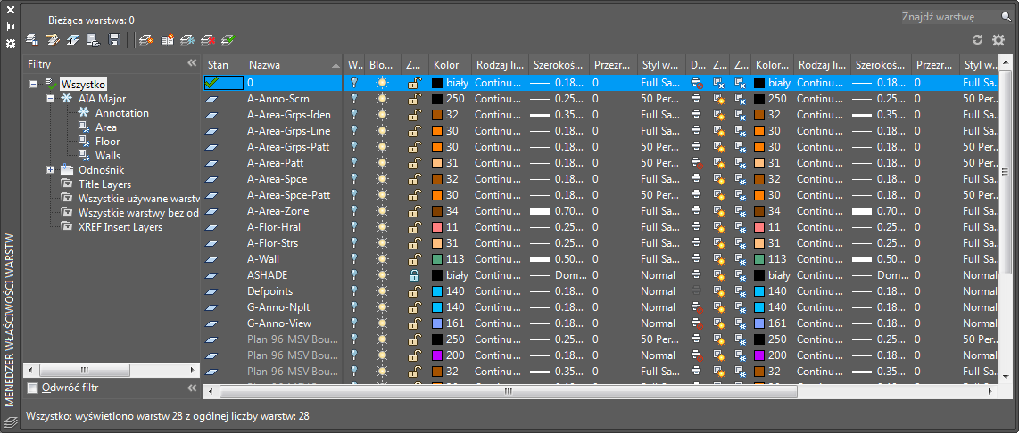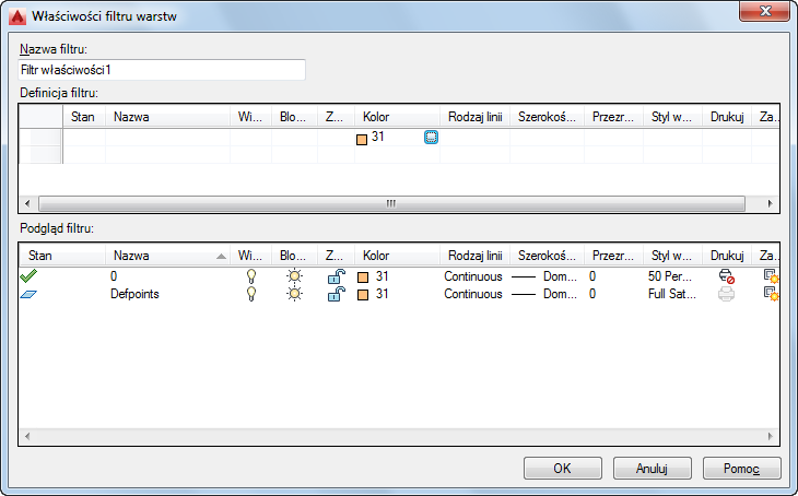 Aby usprawnić zarządzanie dużymi zestawami warstw, można utworzyć filtry warstw. Menedżer właściwości warstw umożliwia tworzenie trzech typów filtrów warstw: filtrów grup, filtrów właściwości i filtrów standardów warstw. Filtry właściwości grupują warstwy w oparciu o właściwości i stany warstw, takie jak np. widoczność lub kolor. Filtry grup zawierają wszystkie warstwy, które zostały do nich wprowadzone. Filtry standardów zawierają warstwy skojarzone z określonymi kategoriami standardów warstw.