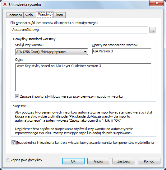 Ustawienia warstw w oknie dialogowym Ustawienia rysunku. Należy zwrócić uwagę, że styl klucza warstw ustawiony został na automatyczne importowanie oraz, że zaznaczona została opcja Zapisz jako domyślny. Dzięki temu nawet po utworzeniu nowego rysunku bez szablonu załadowany zostanie właściwy styl klucza warstw. Należy także zwrócić uwagę, że zaznaczone jest pole wyboru Zawsze importuj styl kluczy warstw przy pierwszym użyciu w rysunku. Jest to opcja skojarzona z rysunkiem, którą należy włączyć w szablonie. Spowoduje to, że najnowsza wersja stylu klucza warstw będzie używana również w rysunkach już rozpoczętych.