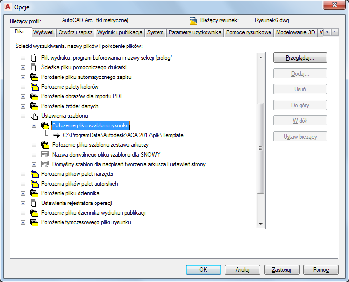 Konfigurowanie położenia pliku szablonu w oknie dialogowym „Opcje”.