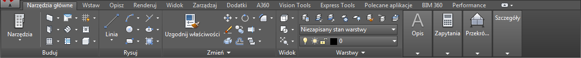 Karta Narzędzia główne zawiera najczęściej używane w programie polecenia. Można tam znaleźć podstawowe narzędzia obiektów i rysunkowe, jak również inne często używane narzędzia , takie jak narzędzia zmian, warstw i podstawowych opisów. Karta Narzędzia główne służy jako punkt początkowy w nowym rysunku.