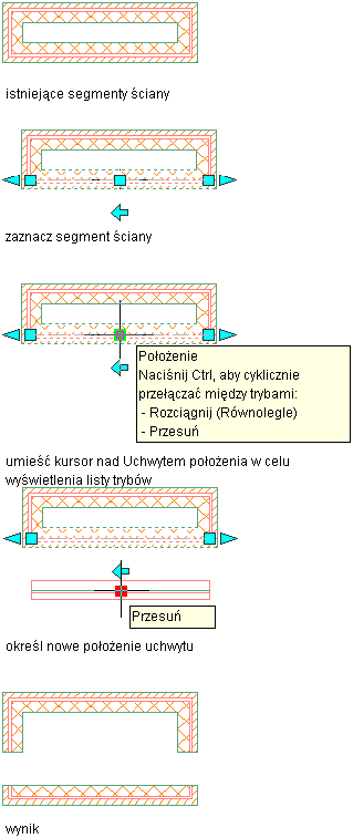 Procedura ta służy do zmiany położenia ściany za pomocą uchwytu Położenie. Podczas pracy z uchwytem położenia należy rozważyć dwa przypadki segmentów ścian: równoległe i nierównoległe.