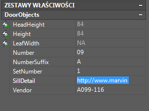 Uwaga: Możesz także zdefiniować pole domyślne dla właściwości ręcznej w definicji zestawu właściwości. Jeżeli na przykład chcesz, aby wszystkie ściany miały pole, które będzie wyświetlało ostatnią datę zapisu rysunku, możesz wprowadzić pole „SaveDate” w definicji zestawu właściwości, przez co będzie wyświetlane dla każdego obiektu połączonego z zestawem właściwości.