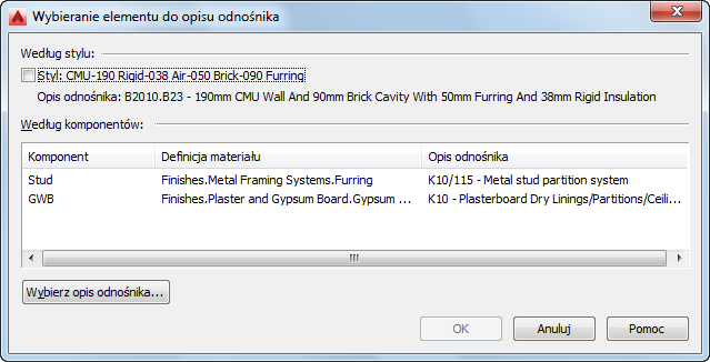 | ze stylem obiektu lub z definicją materiału wybranych komponentów obiektów został już skojarzony jeden lub więcej opisów odnośników | Zostanie wyświetlone okno dialogowe wyboru elementu do opisania odnośnikiem.