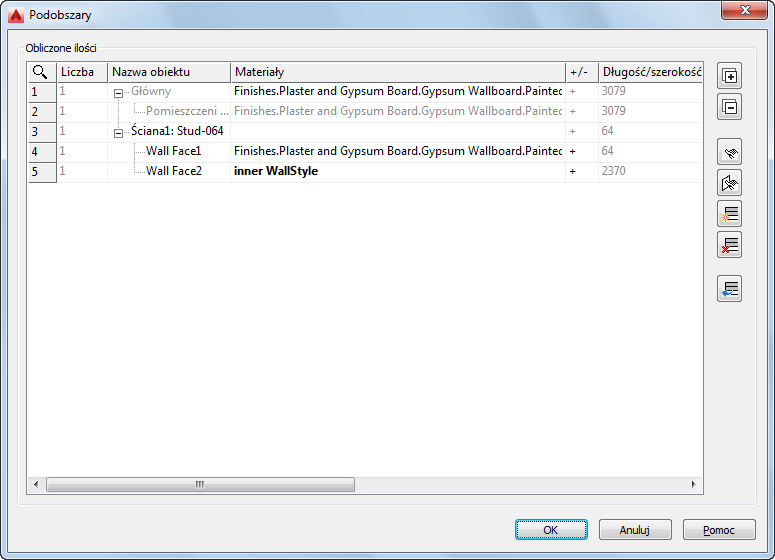 W oknie dialogowym Podobszary wyświetlana jest lista wszystkich powierzchni podrzędnych, które są obliczane dla głównego obiektu. Takie podobszary jak otwory (okna lub drzwi) w ścianach są automatycznie rozpoznawane przez system i obliczane zgodnie z regułami zdefiniowanymi w opcji Ustawienia obliczeń. Podobszary można definiować (dodawać lub odejmować) ręcznie.