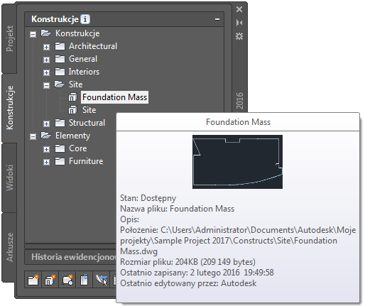 W nawigatorze projektu można wyświetlić miniatury podglądu rysunków projektu. Podgląd może zawierać grafikę, szczegół lub kombinację grafiki i szczegółu. Wyświetlanie miniatur może być pomocne podczas nawigacji w obszernych projektach zawierających wiele rysunków.