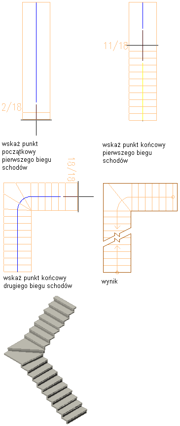 Poniższa procedura dotyczy tworzenia schodów dwubiegowych łamanych z jedną stopnicą na zabiegu.