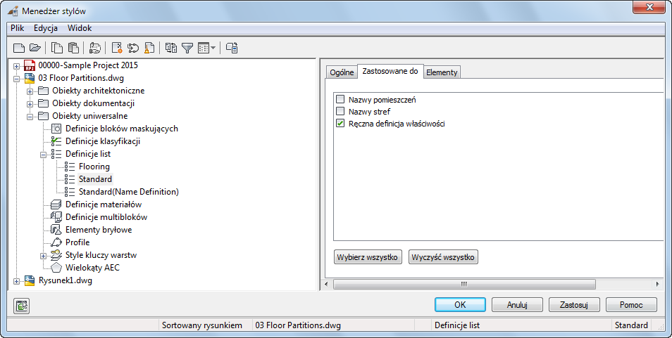 Uwaga: Definicje list mogą być również tworzone dla nazw pomieszczeń i stref.