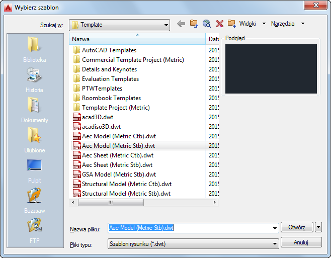 Szablony rysunków dostarczane wraz z programem znajdują się w folderze C:\ProgramData\Autodesk\ACA <wersja>\plk\Template. Pliki szablonów mają rozszerzenie DWT.