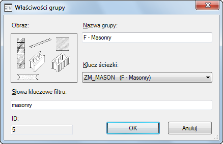 | Słowa kluczowe filtru | Lista rozdzielonych przecinkami słów kluczowych używanych podczas wyszukiwania komponentów w tej grupie w Menedżerze komponentu szczegółu. Jest to pole opcjonalne. |