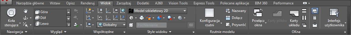 - Okna. Panel ten zawiera większość poleceń znajdujących się w poprzednich wersjach programu w menu Okno. Panel ten umożliwia przełączanie pomiędzy otwartymi rysunkami, rozmieszczanie otwartych okien na ekranie, blokowanie okien obszaru roboczego, wyświetlanie i ukrywanie paska stanu okna rysunku, włączanie i wyłączanie elementów na pasku stanu okna rysunku oraz wyświetlanie okna tekstowego.