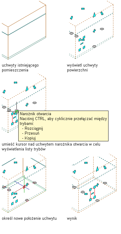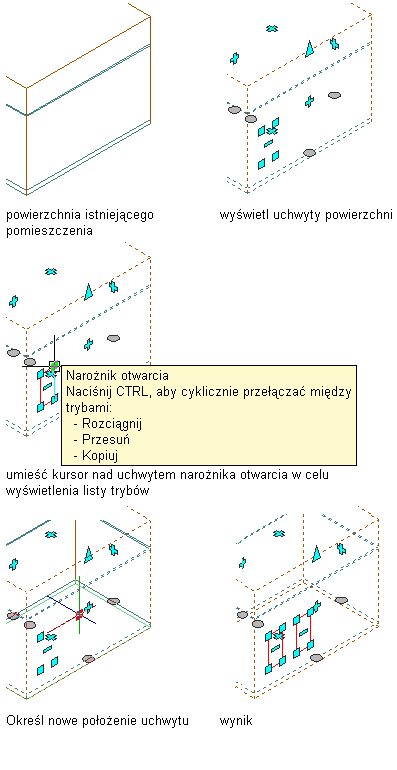 Ta procedura umożliwia rozciągnięcie, przesunięcie lub skopiowanie otworu w powierzchni wyciągniętego pomieszczenia 3D.