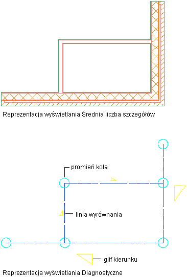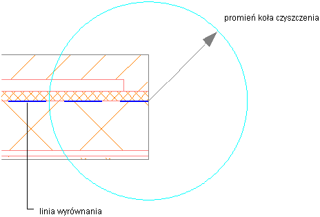 Linie wyrównywania ścian i okręgi czyszczenia są właściwościami obiektów ścian, które są używane do wyznaczania warunków czyszczenia. Okręgi czyszczenia są wyświetlane w przypadku ścian tylko w diagnostycznej reprezentacji wyświetlania lub gdy zostanie włączone wyświetlanie linii wyrównywania ścian.