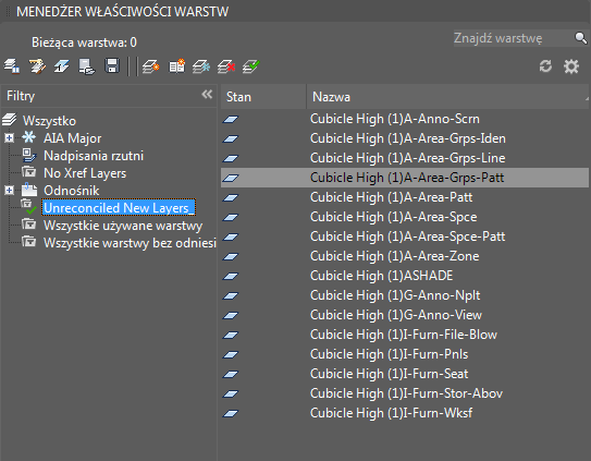 Kliknięcie łącza powoduje otwarcie Menedżera właściwości warstw i automatyczne wybranie filtru Nowe warstwy nieuzgodnione. Wszystkie nowe warstwy, które zostały dodane do rysunku lub dołączonych odniesień zewnętrznych wyświetlane są w formie listy.