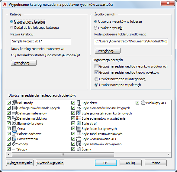 Uwaga: Jeśli obie opcje są włączone, katalog najpierw grupowany jest wg rysunków, a następnie wg typów obiektów, program tworzy zatem kategorie z rysunków i palety z typów obiektów. Rozwiązanie takie przyjęto, ponieważ palety nie mogą być zagnieżdżone. W takiej sytuacji przyciski opcji dla kategorii i palet są wyłączone, a dla kategorii wybrana jest opcja tworzenia narzędzi w paletach.