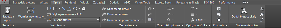 - Wymiary. Ten panel zawiera polecenia służące do wstawiania i edycji zarówno wymiarów AEC, jak i wymiarów programu AutoCAD.