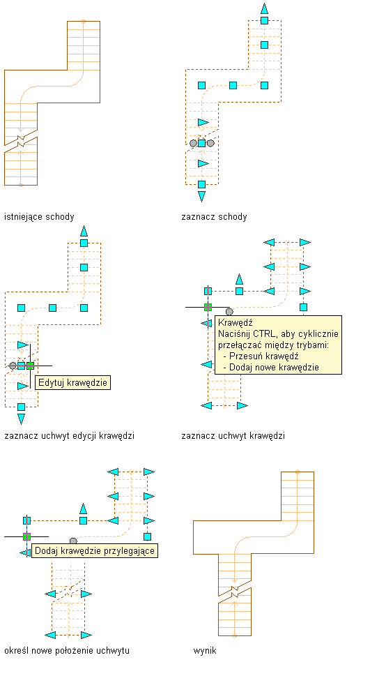 Użyj tej procedury, aby zmienić kąty i położenie krawędzi spoczników w schodach w kształcie U i w schodach wielospocznikowych. Każda krawędź spocznika może być zmieniana lub przesuwana indywidualnie za pomocą uchwytów.