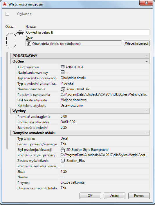 Do właściwości narzędzia znacznika opisowego należy używany styl przekroju/elewacji 2D, biblioteka stylów, z której ma on być zaimportowany, oraz domyślna skala i zestaw wyświetlania.